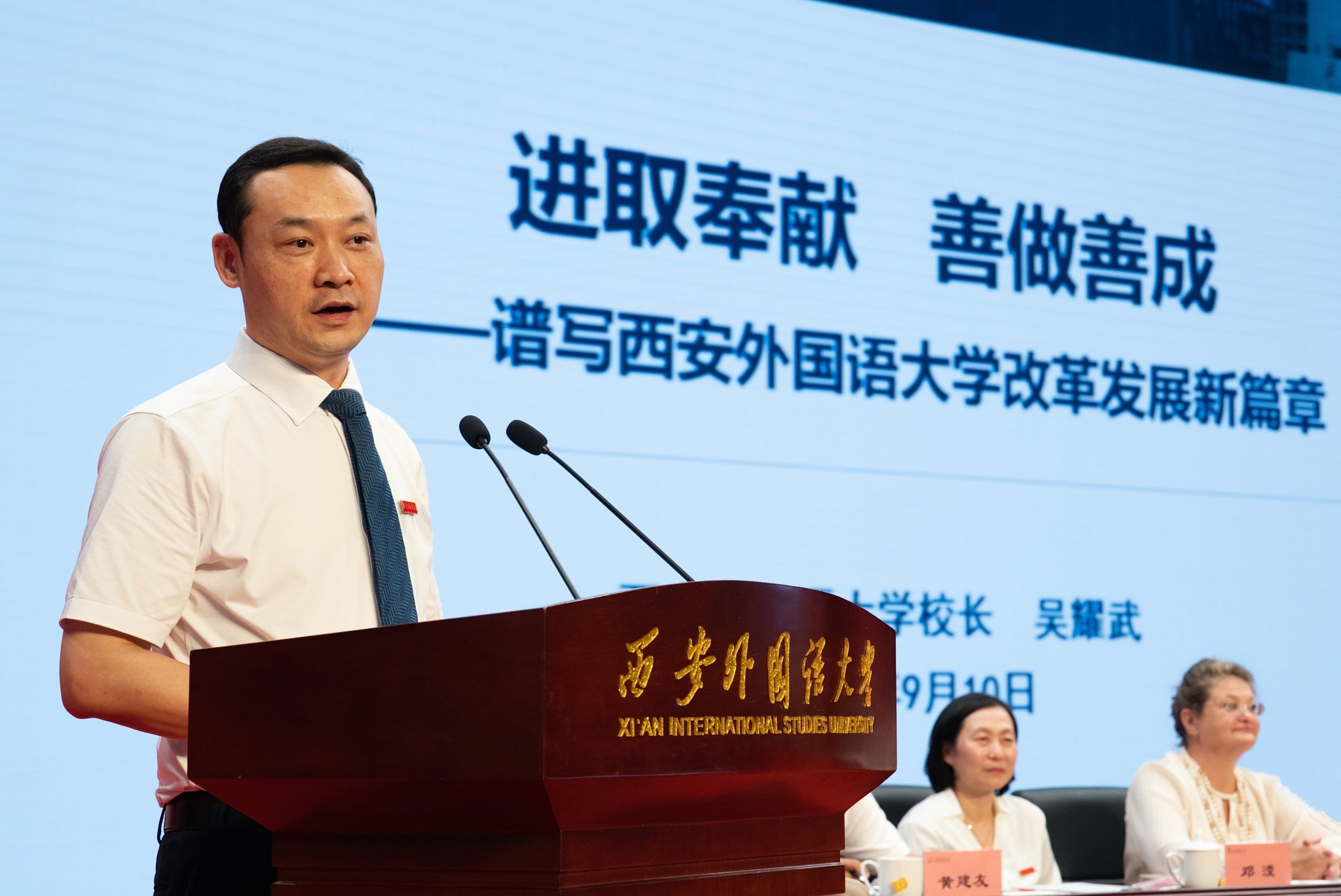 吴耀武向教学、科研、管理一线的全体教职工致以节日祝福,为受表彰的先进单位与个人送上祝贺,向退休老同志致以敬意、向新入职教师表示欢迎,同时感谢海内外校友的牵挂与社会各界的支持,特别提到汇源集团此次捐赠实训平台并赠送寓意“桃李满天下”的桃汁,用暖心举动为教职工送上节日问候。过去一年,学校兑现改革承诺,各项事业发展成效显著。综合改革方案全面落地、学科专业建设成效显著、持续抢占国际传播高地、攻坚克难连续取得突破、学校政治生态明显好转。西外始终用心用情把师生放在心上,展望新学年,学校将聚焦核心任务,优化人才培养与引育机制,狠抓教风学风作风,提升考核激励力度。校长呼吁全体教职工珍惜发展局面,以“爱学生、爱岗位、爱学校”的热忱投入工作,共同推动学校回归高质量发展轨道。