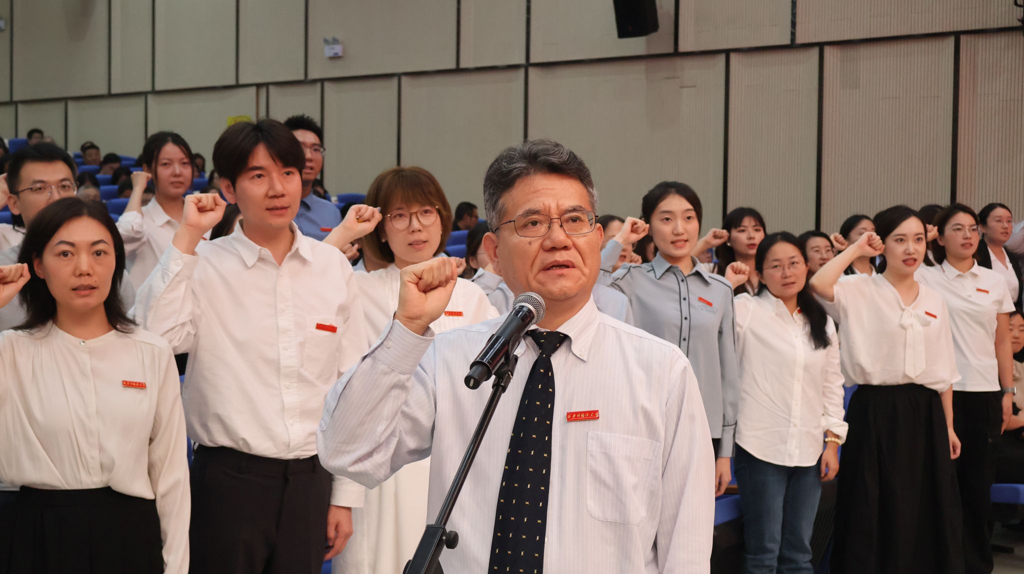 新入职教师代表在毋育新教授的带领下,紧握右拳、高声宣誓。