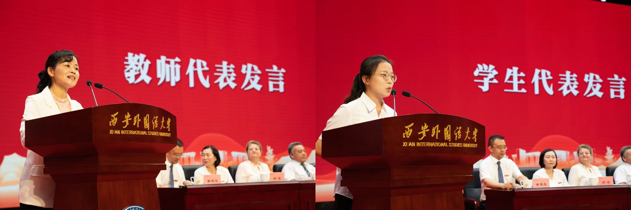 学生代表日本文化经济学院2025级硕士研究生田雨晴回顾了自己从本科到硕士深耕西外的求学历程,用真挚的语言向辛勤耕耘的老师们致以最崇高的问候和感谢,并以饱满的热情讲述了自己和老师之间的故事,表达了对老师的感恩与敬爱之情。