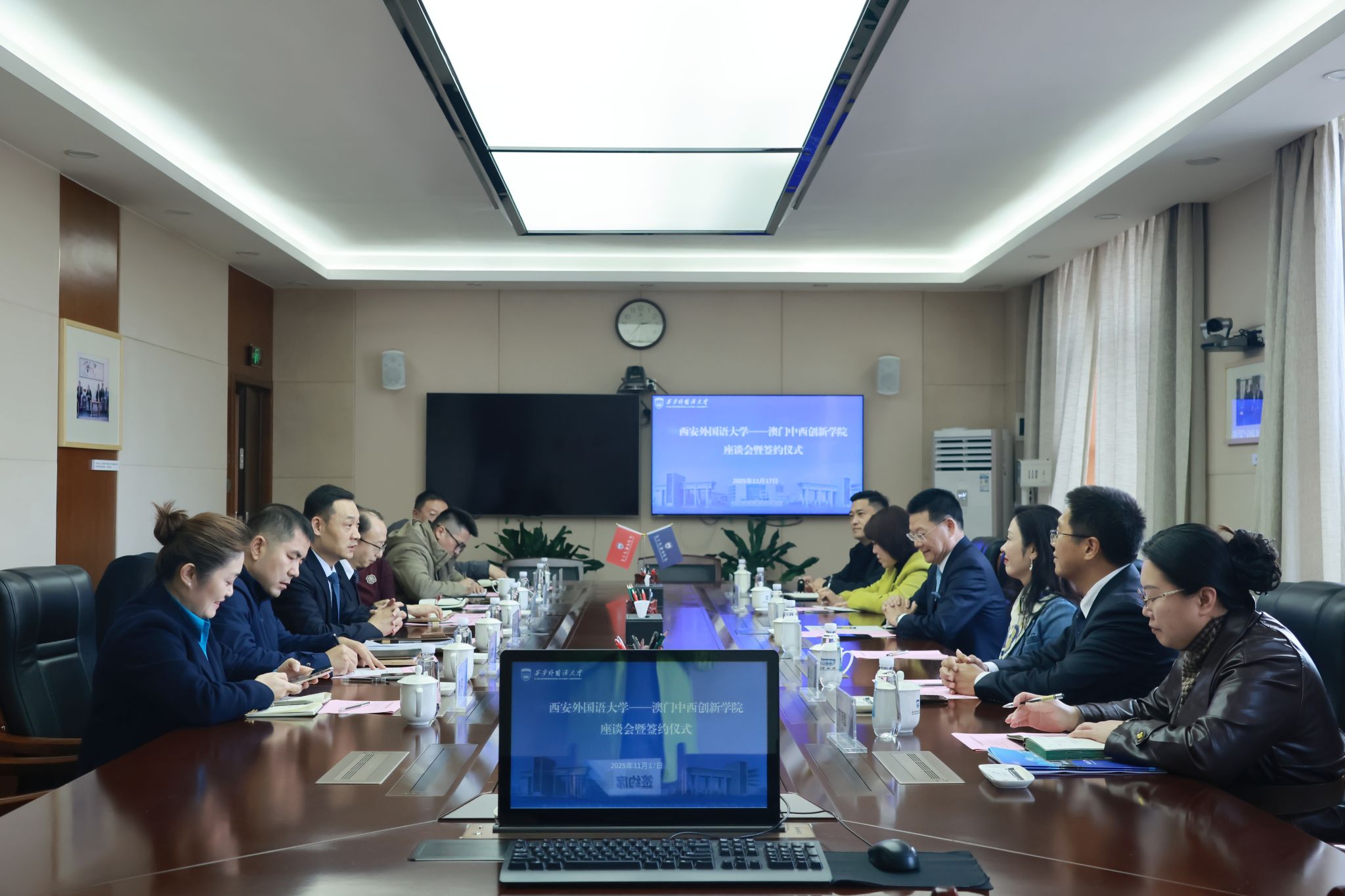11月17日下午,澳门中西创新学院校长仲伟合一行来校交流访问。校党委书记刘振涛、校长吴耀武会见了仲伟合校长一行,副校长黄立波陪同会见并主持座谈会。高级翻译学院、新闻与传播学院、英文学院、旅游学院、附属中小学负责人及相关职能部门代表参加座谈。